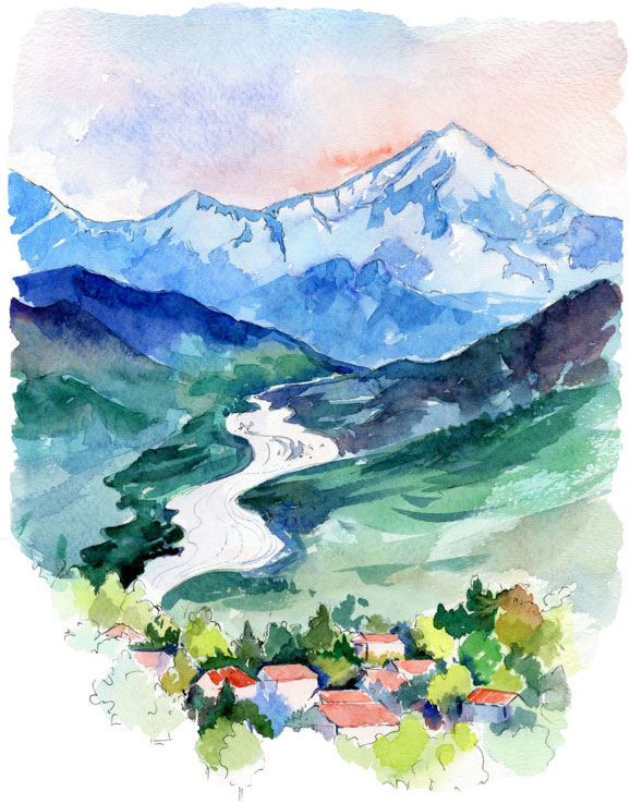 Деревенька вдоль хребта одной из них. В окружении более высоких своих соплеменниц. Масштабно. Живописно. Зелено. Не ветрено. Можно не прятаться. Смотрит по сторонам, с аппетитом пожевывая свою фруктовую заначку с завтрака.