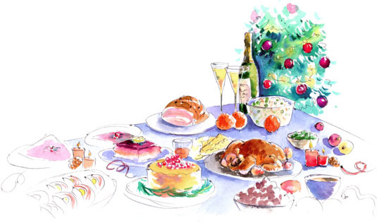 Пока дополз, стол уже был накрыт полностью. Птица с яблоками. Пирог. Закуски. Бутылки. Графин с красной жидкостью и плавающими в ней фруктами и специями. Теплые носки с узорами над камином. Свечи. Украшения.