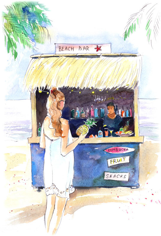 К барной стойке подошел отдыхающий, присел. Ждет. Червячок тоже ждет. Смотрит. Принесли коктейль с кусочком фрукта в качестве украшения. Спрыгнул отдыхающему на кепку. И направился к столику рядом с лежаком…