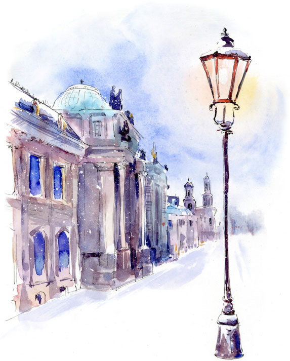 Широкая городская набережная. Фонари. Деревья. Все в снегу. И все молчит.