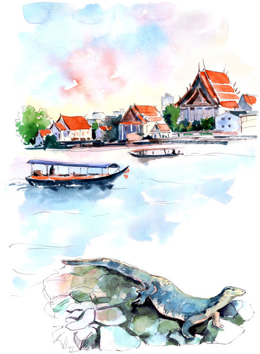 Большие вараны. Как каменные статуи. Загадочные. Внушительные. Впечатляющие. И практически незаметные среди свай и камней многоликого и многогранного города на воде. Яркие краски лодок. Вдоль широких речных каналов. Лазурное небо. Солнечный день. Брызги. Шум мотора. Внимательные глаза червячка, сидящего в лодке с туристами. У кучи булок. Как назло, упакованных. Смотрит. На протекающие мимо храмы. Пальмы. Каменные берега. То тут. То там. Ступеньками спускающиеся к воде. На прочные дома. И ветхие хижины. На мосты. И на варанов…