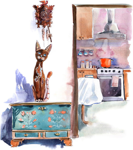Деревянный коричневый кот. На сундуке. Расписной. Пряничный. Плоский. Мечтательный. И смотрящий куда-то вверх и в сторону на фоне намеренно неровно оштукатуренной белой стены. Деревянные часы. Там же. Над котом. Привезенные когда-то из заснеженного сувенирного магазина. Шум осени, хлещущей ветром и дождем по щекам машин, домов, фонарей, деревьев, парков и бог его знает что потерявших в такую непогоду прохожих. Червячок. На одной из полок с кашмирскими казанами. В кухне-студии. Смотрит на кота, спящего у окна, на подоконнике. На теплом хозяйском жакете. И на плошку с ароматными осенними яблоками на том же подоконнике. Решился. Спрыгнул вниз на столешницу и пополз. Остановился. В ужасе. Приоткрывшийся глаз кота на запах хозяйки, подошедшей к холодильнику. Зевнул. Лениво и с удовольствием потянулся. Позволил себя немного погладить. И спрыгнул вниз, за хозяйкой, в направлении вкусного ужина. Червячок. Выглянул из-за чайника. Никого. Ползет дальше. Миксер. Банки с мукой и сахарным песком. Баночка с ванилью. Баночка с изюмом. Нераспечатанная пачка масла. Еще совсем немного. Пакет с молоком. Кот. Внимательно наблюдающий сверху, на той же столешнице. Оцепенел. Большой внимательный влажный нос. Приближающаяся игривая лапа. Зажмурился. Спасительное «А ну-ка брысь отсюда!». Обиженное «Мяу!». Плошка с яблоками. Аромат запекающихся в духовке румяных булочек с изюмом. На ужин. С чаем. Шум ветра за окном. Капли дождя. Размытые пятна света. А в яблоке темно, тепло и сухо… тик-так. Тик-так.