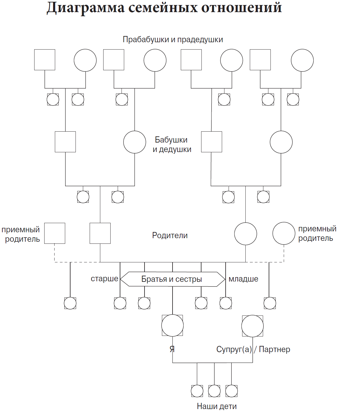 Нам необходимо нарисовать детальную диаграмму своей семьи, чтобы более чётко увидеть последствия семейной дисфункции в нашей сегодняшней жизни. Эта работа очень важна для выполнения Первого Шага.
