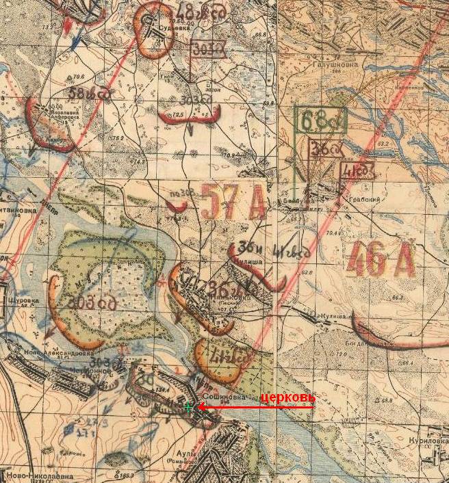 * * *236 СД 46 А форсировала Днепр напротив восточной окраины Сошиновки (ориентир Церковь рассмотреть можно с трудом, обозначение церкви крестом можно найти на других картах далее, поэтому обозначения добавлены мной). На одной из аналогичных карт 46 А (к сожалению, плохого качества) линия разграничения проходит через юго-восточную окраину Сошиновки, ориентир «Церковь». Есть документы подтверждающие это. Дополнительную путаницу вносит форсирование Днепра 46 А в полосе 41 СД 57 А напротив Сошиновки.