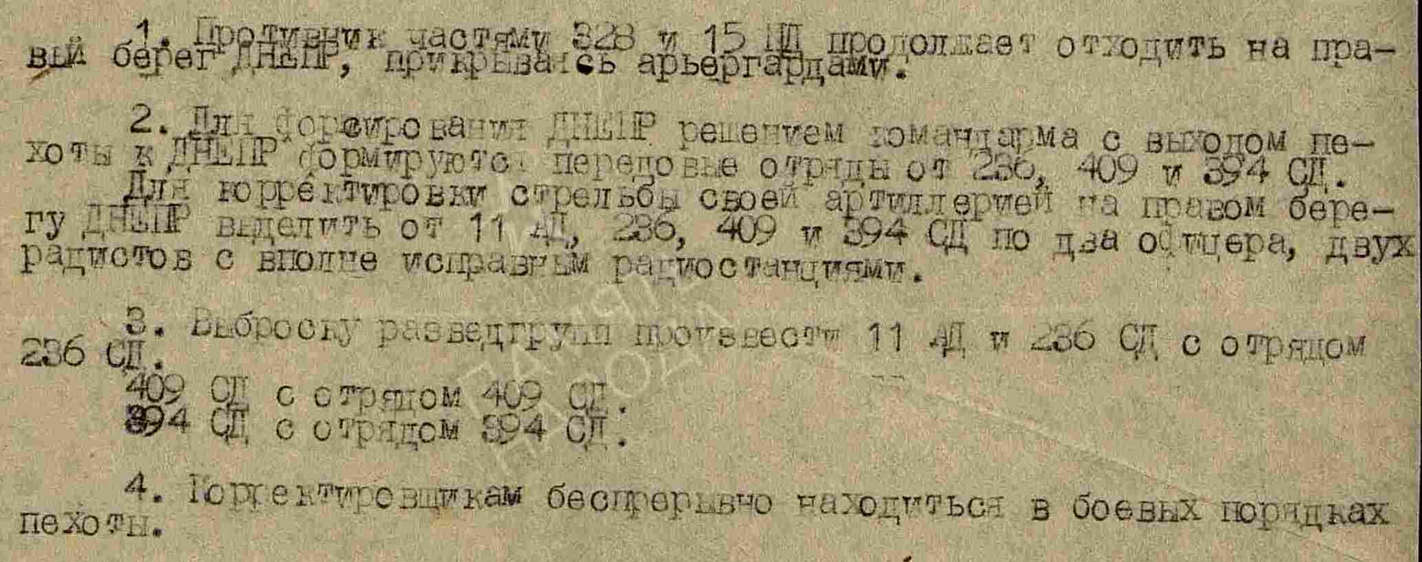 В приказе начальника штаба артиллерии 46 А по разведке № 013 [d13] полковника Салянского от 24.09.43 г., начальнику штаба 11 АД. написано, что передовому отряду 236 СД придается офицерская разведка – два корректировщика огня с двумя радистами с вполне исправными рациями: