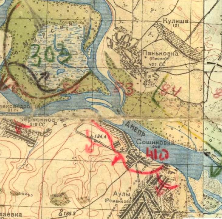 АЖ: Части Армии на своем правом фланге в ночь на 26.9 произведя частичную перегруппировку в полосе Армии, частью сил 236 СД в 3.30 26.09 форсировали р. ДНЕПР в районе АУЛЫ и овладели восточной окраиной СОШИН0ВКА и северной окраиной АУЛЫ, продолжая вести бой за расширение плацдарма на южном берегу.