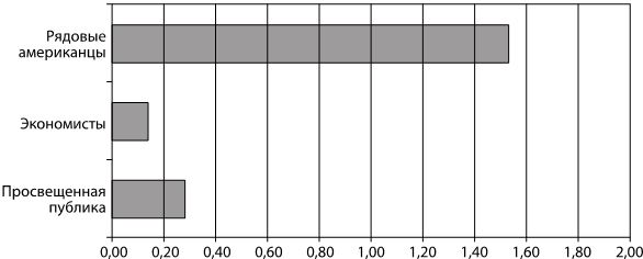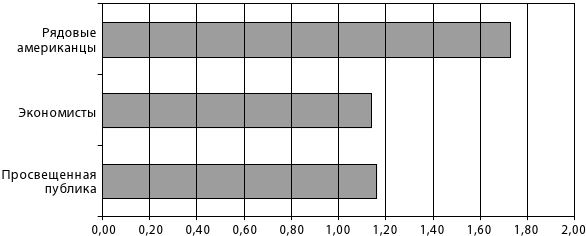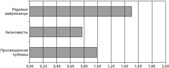 Повторюсь, что если корыстные предубеждения и идеологические предубеждения полностью объясняют разницу во взглядах между неспециалистами и экспертами, то среднестатистический ответ просвещенной публики будет равен среднестатистическому ответу рядовых американцев. Если же корыстные предубеждения и идеологическое предубеждение вообще не объясняют разницы во взглядах между неспециалистами и экспертами, то среднестатистический ответ просвещенной публики будет равен среднестатистическому ответу экономистов. Если истина лежит где‐то посередине, то среднестатистический ответ просвещенной публики будет стоять где‐то посередине между ответами рядовых американцев и экономистов.