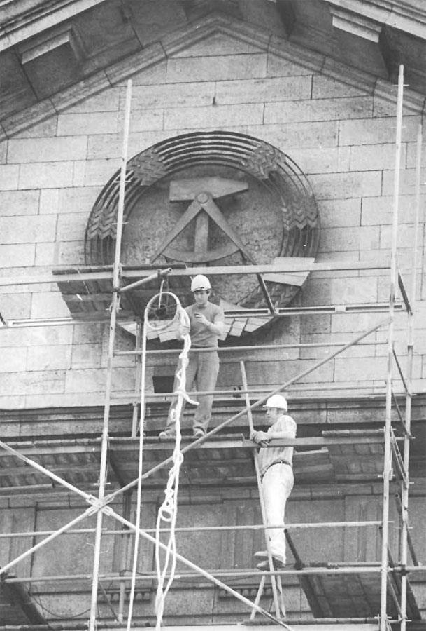 23 августа 1990 года Народная палата ГДР приняла решение о «присоединении Германской Демократической Республики к Федеративной Республике Германии на основе статьи 23 конституции ФРГ, вступающее в силу 3 октября 1990 года». Тем самым Народная палата обозначила момент, когда с лица земли должны были исчезнуть последние следы репрезентационной среды ГДР. После стихийного демонтажа гэдээровских символов осенью и зимой 1989-го, после 1990-го, когда из публичных пространств удалялись наглядная агитация и флаги ГДР, а учреждения и предприятия отказывались от своих социалистических наименований, в ночь на 3 октября с фасадов и табличек государственных учреждений и ведомств должны были быть окончательно изъяты последние упоминания о ГДР.