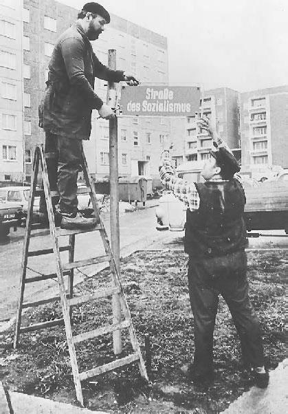 В обращении с символической средой ГДР существовало четкое различие между провинцией и большими городами. Мэрии крупных городов избавлялись от социалистической символики быстрее и решительнее, чем органы местного самоуправления сёл и небольших городов. Так, на протяжении первых двух десятилетий после объединения за пределами столиц можно было встретить множество памятников и произведений декоративно-прикладного искусства времен ГДР. Аналогичная ситуация наблюдалась и с переименованием улиц. Даже в наши дни, путешествуя на машине по «новым» федеральным землям, можно увидеть весь спектр социалистических названий: от улиц Единства, Товарищества, Земельной реформы, просто Дружбы и Дружбы народов до Жертв фашизма, Строителей новой жизни, Юных пионеров. А мужчины и женщины, являющиеся носителями социалистической традиции, продолжают служить в местных топонимических комиссиях. Однако количество их постепенно сокращается.