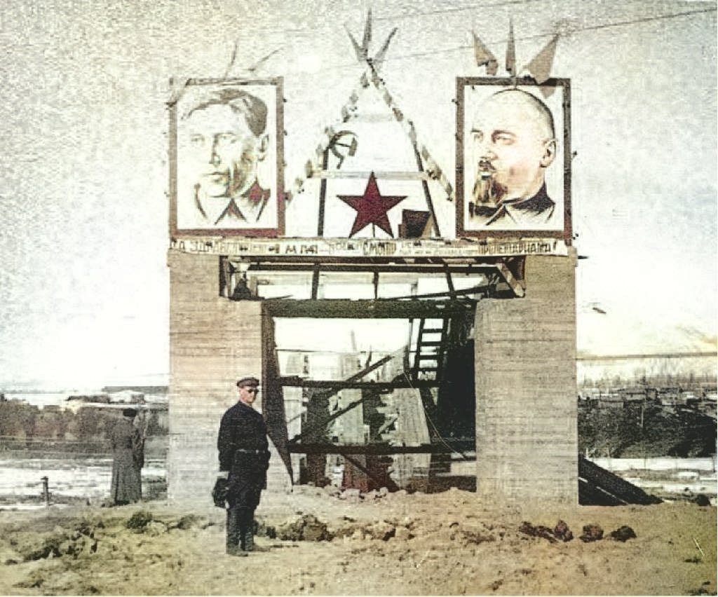 Фото №4. (архив Дорожевца А.Н.). Май 1937 г. – Мост через Колыму соединил берега реки. Арки готовы, осталось установить дорожное полотно – оно будет завершено в июне 1937 г., и первый автомобиль по мосту пересечет Колыму. На правом берегу видны многочисленные бараки – в них жили строители моста – и вольнонаёмные, и заключённые. Намного правее на берегу стояли жилые дома семей начсостава Колымского полка. Удивительно, что это фото сохранилось в чьем-то семейном архиве. За его хранение в 1938 г. и позже можно было получить срок. На празднично оформленных опорах моста висят портреты будущих "врагов народа" – слева портрет наркома НКВД Ежова, справа – директора Дальстроя Берзина.