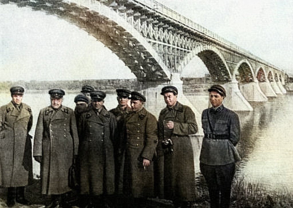 Фото №16 (архив Дорожевца А.Н.). Осень 1938 г. – Начсостав Колымского полка на левом берегу реки на фоне Колымского моста. Так выглядел мост при обычном уровне воды. Представьте себе высоту наводнения 1939 года, если над водой осталась только верхняя треть арочных пролетов.
