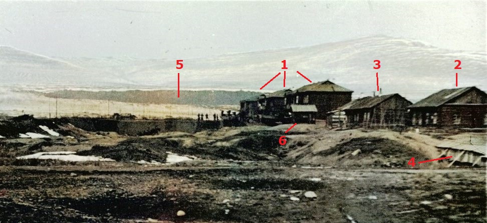 Фото №20а (архив Дорожевца А.Н.). Дебин, конец сентября 1939 г. – Три двухэтажных дома для семей начсостава (1). На горке – столовая для командиров (будущая почта «на горке») (2) и детский сад (будущий продмаг) (3). Виден короб с трубами отопления и водопровода над ручьём (в наше время вместо ручья остался лишь овраг) (4). Темное пятно вдали – стрельбище Колымского полка (будущее поле с лыжней) (5). Маленький домик возле первой двухэтажки – магазин для начсостава (6).