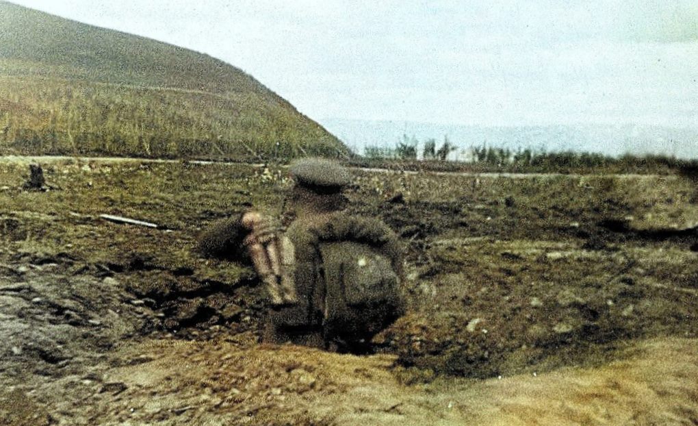 Фото №26 (архив Дорожевца А.Н.). Дебин, лето 1940 г. – Занятия по гранатометанию. Окопы рядом с трассой у поворота на кладбище. У Прижима ещё нет привычного обвала породы. Он появится в 1944 г. после расширения дороги у обрыва. А пока на крутом склоне – кусты и деревья.