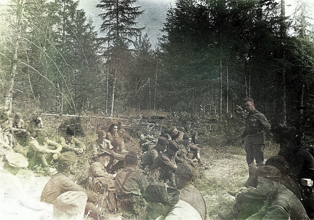 Фото №28 (архив Дорожевца А.Н.). Лето 1942 г. – Разбор политической обстановки проводит батальонный комиссар Чадов.