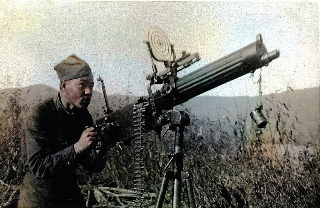 Фото №30 (архив Дорожевца А.Н.). Июль 1941 г. Левый берег Колымы. – Красноармеец Куксин – отличный наводчик станк-пулемета.