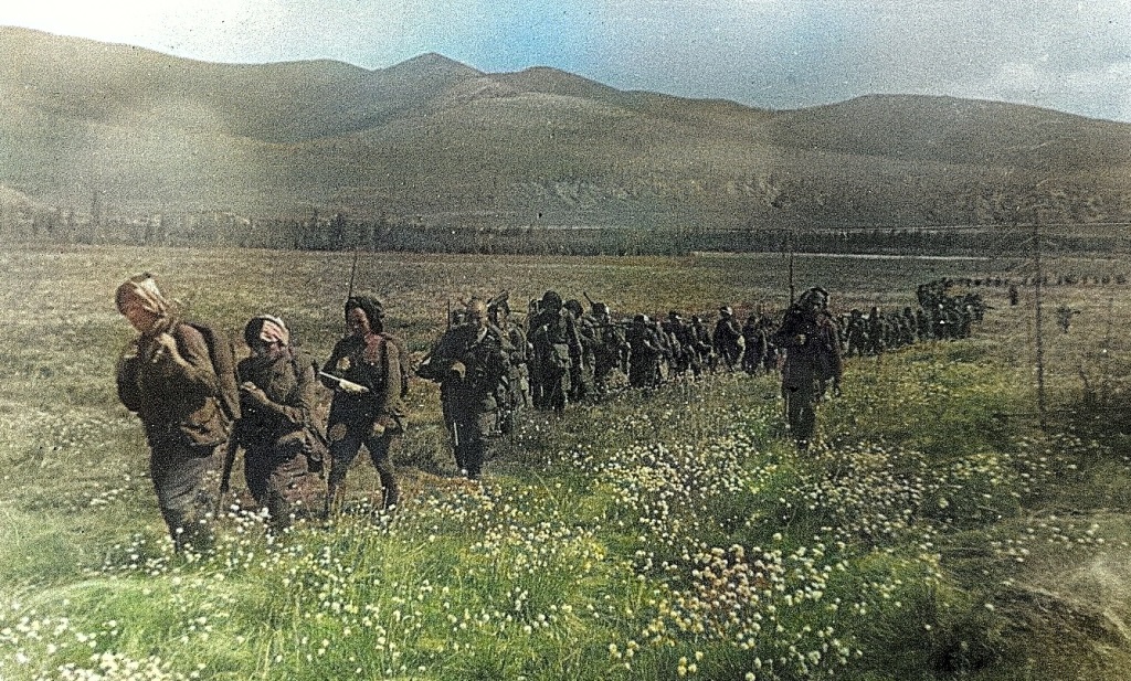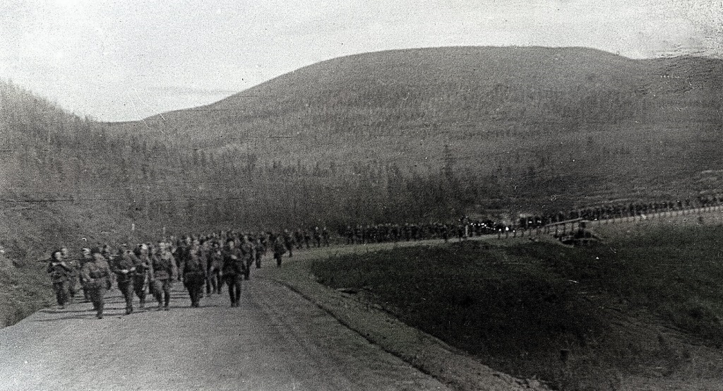 Фото №31 (архив Дорожевца А.Н.). Лето 1941 г.– Стрелковый батальон Колымского полка на марше по Колымской трассе.