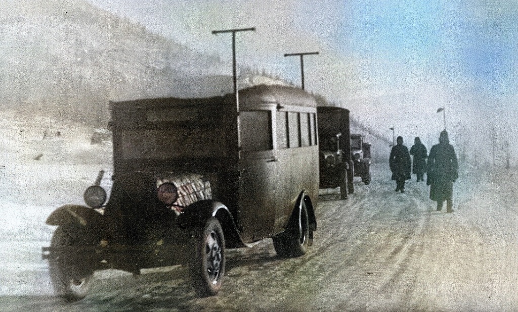 Фото №35 (архив Дорожевца А.Н.). Зима 1943 г. – Транспортировка стрелкового батальона по Колымской трассе.