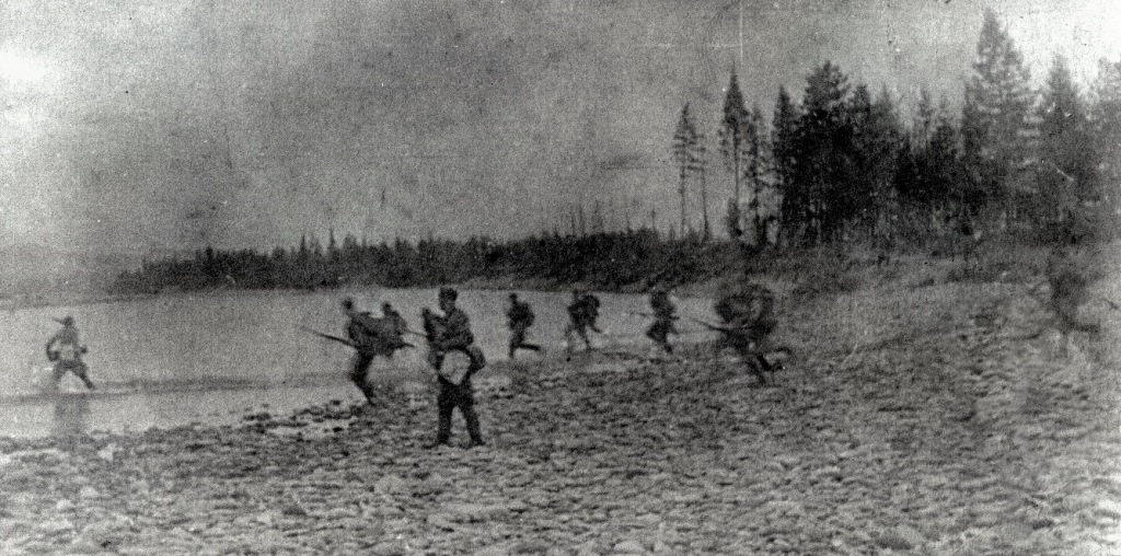 Фото №38 (архив Дорожевца А.Н.). Лето 1940 г. – Красноармейцы тренируются захватывать брод в районе р. Таскан.