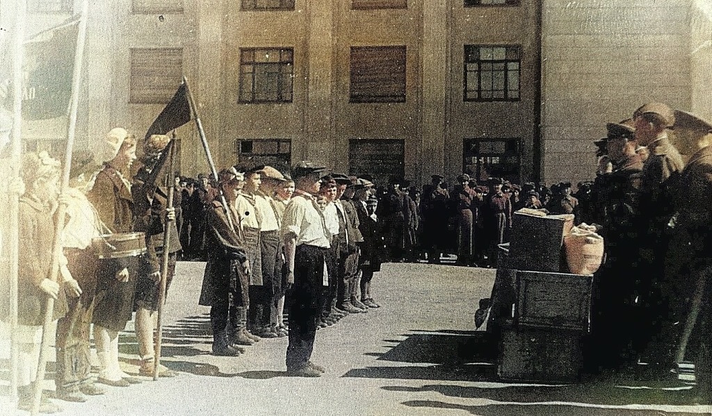 Фото №41 (архив Дорожевца А.Н.). Весна 1943 года – Пионеры Дебинской школы приветствуют отбывающих на фронт.
