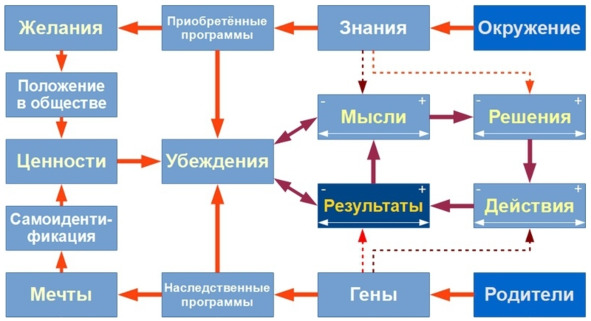 5. Результаты не появляются сами по себе, просто потому что вы действуете. Действовать можно по-разному и получать разные результаты. Ваши действия зависят от ваших решений, а решения – от ваших мыслей. Но мысли в вашей голове тоже не рождаются сами по себе. Они зависят от ваших убеждений, которые, в свою очередь, строятся на основе ваших ценностей, влияния наследственных программ и окружения.