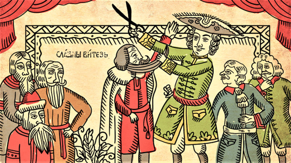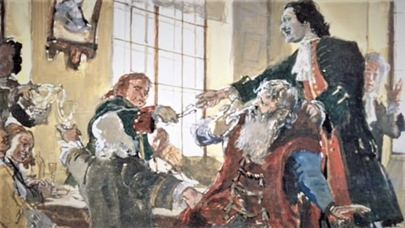 В дворцовых стенах молодой царь Пётр, в изрядном подпитии на первых русских ассамблеях, стриг боярские бороды и длинные рукава традиционных кафтанов, нанося публичные оскорбления его владельцам.