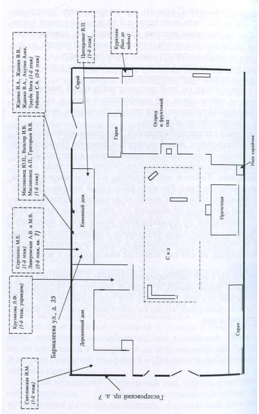 Слева от калитки располагался деревянный дом. Каменный дом не был виден, так как его закрывал флигель деревянного. Прямо и слева – небольшая площадка, где мы, дети, играли в волейбол, штандар, лапту, чижика и другие игры. Немного в глубине, справа, когда-то был погреб-холодильник типа землянки, где во время блокады оборудовали бомбоубежище. В конце войны оно было закопано.