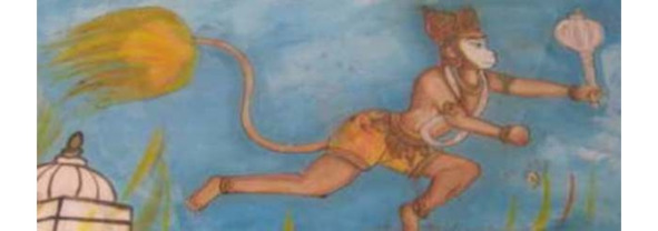 «Служанка Брихаспати Анджана Пунджикаштхала и царь Кешари из Ванара поженились, но никак не могли зачать детей. Бог ветра Вайю прилетел однажды к Анджане и подарил ей семя. При этом он метнул в ее лоно метательные снаряды из пяти металлов – золота, серебра, меди, железа и олова. Как только Хануман появился на свет, он сразу же стал 16-летним. Хануман был быстрым, сильным и неуязвим для огня. Он совершил массу подвигов: принес гору Гималаи с лечебными травами; поджег своим хвостом город Ланку».