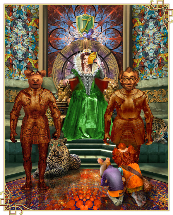 Наши друзья едва сдвинулись с места и на ватных ногах стали приближаться к трону, пока наконец Ее Королевское Величество не приказало им остановиться. Вблизи она казалась еще более зловещей, и ее глаз, не прикрытый веером, так и сканировал их.