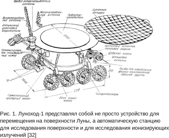 Автоматический самоходный аппарат «Луноход-1» состоит из двух основных частей: приборного отсека и колесного шасси (рис. 1). Вес лунохода составляет 756 килограммов.