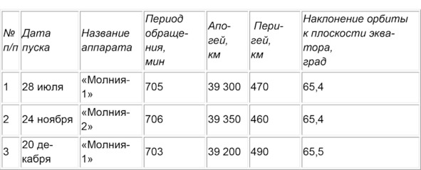 Таблица 1. Запуски спутников серии «Молния»