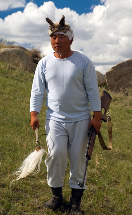 Монгол, охотясь на тарбагана, надевает белую одежду, берет палку с ленточками и идет к нему, пританцовывая. Мол, я – волк. Бедное животное вместо того, чтобы бежать со всех коротких лапок, смотрит на представление с нескрываемым интересом. Тут и получает пулю.