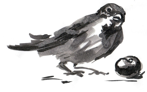 Воробей съел четыре ягоды и половинку пятой. Он округлился так, что пёрышки топорщились на его животе. С сожалением глядя на уменьшившуюся кучку, он тяжело опёрся на хвост и вздохнул.
