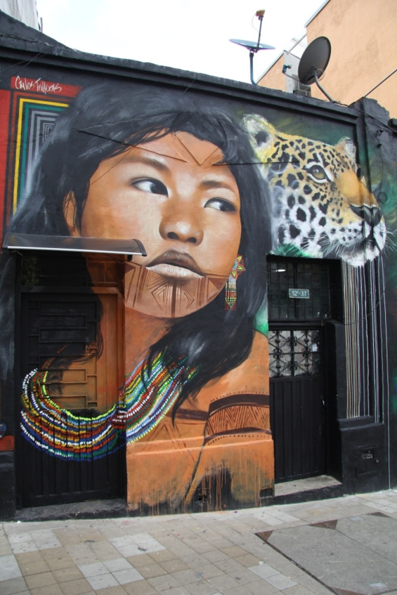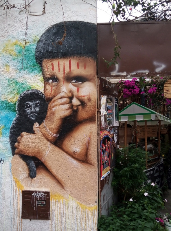На улицах Боготы, в районе Канделария, на стенах домов много граффитти с амазонскими этническими сюжетами. Здесь изображен ребенок нукак-маку