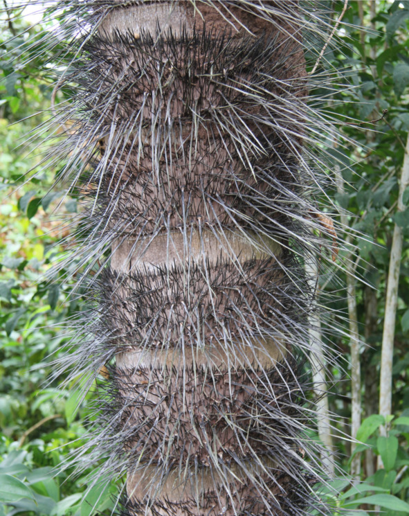 Ствол пальмы Bactris gasipaes или Guilielma gasipaes усеян длинными острыми шипами