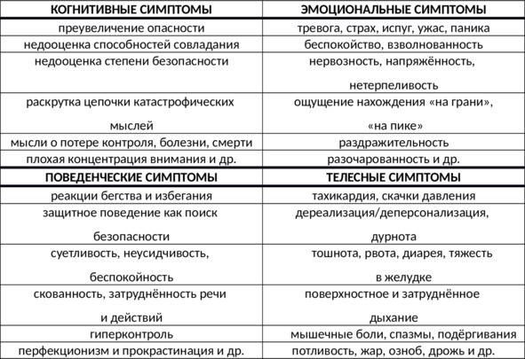 Основные симптомы тревоги, сгруппированные по принципу их принадлежности к когнитивной, эмоциональной, телесной и поведенческой сферам, в наглядном и доступном виде представлены в нижеприведённой таблице (см. таб. 3).