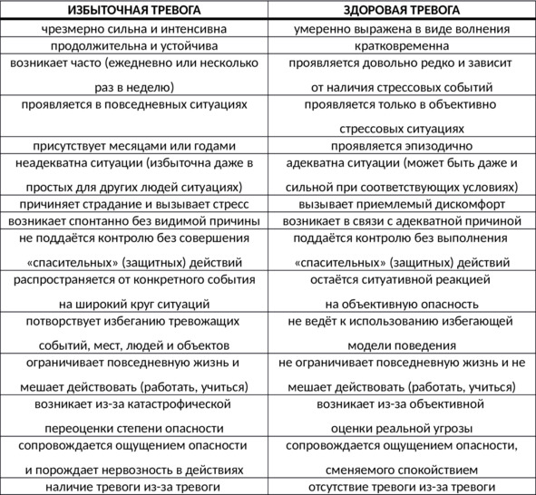 Таб. 4. Отличия избыточной и здоровой тревоги