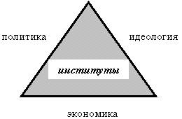 ИМ (см.схему 1) – это устойчивая, исторически сформировавшаяся система базовых институтов, регулирующих взаимосвязанное функционирование основных общественных сфер – экономической, политической и идеологической (общественного сознания). Она обеспечивает взаимодействие трёх основных общественных подсистем – экономикой, политической надстройкой и культурой. Экономика, или хозяйство специализируется в области воспроизводства общественных благ и является материальным базисом развития социума. Надстройка зависит от экономических отношений и представляет собой систему регулирования общественно-политических и правовых отношений. Её основные усилия направлены на концентрацию ресурсов для достижения значимых целей и эффективное функционирование экономики. В рамках этой концепции общественное сознание понимается как базовая общественная ценность, выражаемая типом господствующей идеи. Она представляет собой сложившуюся общественную норму, определяющую стереотип поведения членов конкретного общества. Доминирующая идеология определяет принципы использования общественного продукта и, соответственно, пути развития экономики. В политическом сегменте она определяет системцу ценностей и, как следствие, является критерием справедливости государственного порядка и системы общественно правовых отношений.