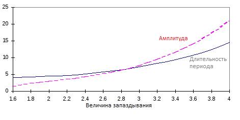 Запаздывание растягивает длительность периода и увеличивает амплитуду свободных колебаний, приближая её к граничным условиям. В определённый момент автоколебания становятся свободными, т.е. начинают затухать. Это происходит в такой момент , когда фактическая эффективность системы AI начинает снижаться вследствие энтропии или в случае, когда внешняя среда поглощает долю ресурса. При помощи вычислений на компьютере можно построить зависимость максимальной амплитуды и периода от величины запаздывания (рис.17).