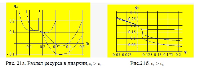 Анализ матрицы Якоби показывает, что раздел ресурса в точке ) будет стабилен всегда, а в точке ) неустойчив при любых значениях и , что отображено на фазовых траекториях, отображённых на рис. 21а и б.