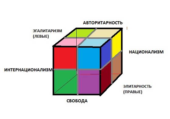 При превышении агрегированным показателем значения 4 неизбежен полный демонтаж глобальной системы международных отношений, при условии, что бывший доминант не попытается восстановить своё прежнее положение при помощи силы. После этого каждый из фрагментов прежнего „глобального мира” будет искать свой аттрактор в силу своих этносоциальных особенностей. Их условно можно отобразить в трёхмерном пространстве, изображённом на рис. 42. Одним из его измерений является самоидентификация нации в геопространстве, другим – социальная направленность, а третьим – структура власти.