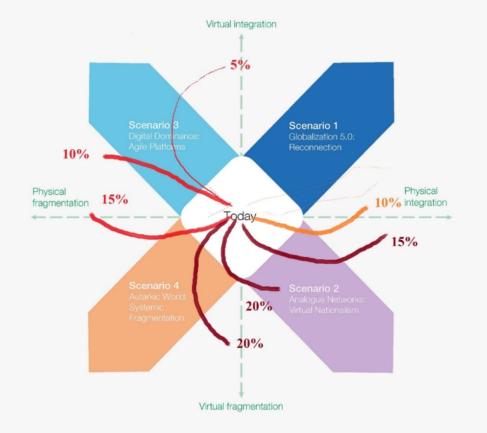 На Всемирном экономическом форуме в Давосе1211 в 2022 году были обрисованы четыре варианта технологического развития земной цивилизации: 1. Globalization 5.0: Reconnection, 2. Analogue Networks: Virtual Nationalism, 3. Digital Dominance: Agile Platforms, 4. Autarkic World: Systemic Fragmentation. Три последних из них диагностируют деесинхронизацию глобалистской модели. В начале 2023 года с этим прогнозом согласились почти все мировые лидеры за исключением европейской элиты. Новый миропорядок станет очередным движением „от общего к частному” и приведёт к „кластеризации” земной цивилизации1212. В этом случае основным принципом формирования новых политико-экономических зон станут „парадигмы развития”, основанные на их морально-этических нормах и научно-технических достижениях. Большинство теоретиков склоняются к тому, что каждая из них будет господствовать та или иная форма капитализма, то есть иерархия труда.