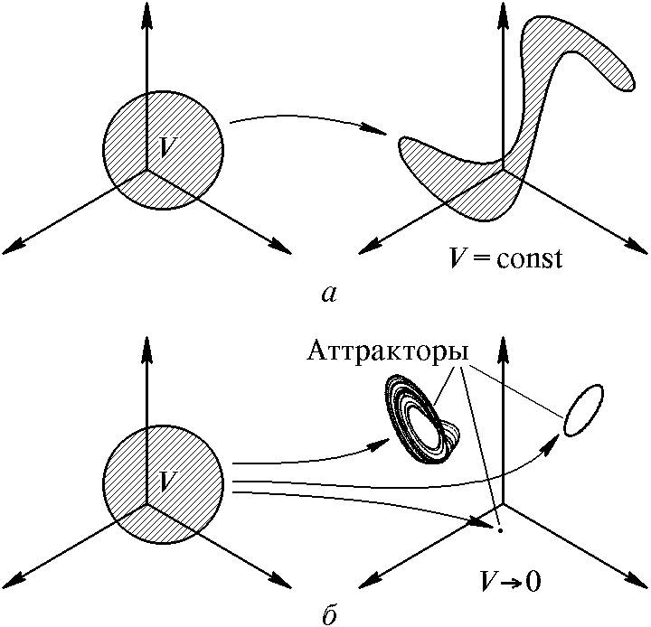 Диссипативные системы характеризуются тем, что с течением времени облако отображающих точек съёживается и концентрируется в одном или нескольких аттракторах119 – подмножествах фазового пространстранства (траекториях). С точки зрения динамики это означает, что режим, возникший в системе, предоставленной самой себе, через некоторый период времени не зависит от её начального состояния120. Каждый аттрактор инвариантен121, т.е. траектория, начавшаяся в нём, за его пределы не выходит. При наличии в фазовом пространстве двух или более аттракторов имеет место мультистабильность, а множество точек фазового пространства, из которых траектории выводят на аттрактор – его бассейном.