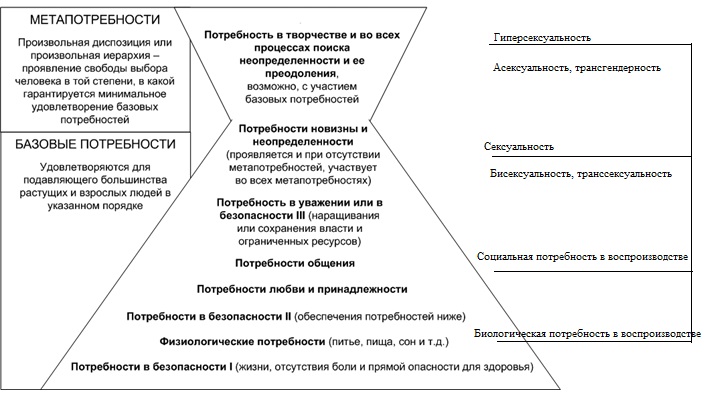 Таким образом, мотивация поведения на основании потребностей может быть распространена не только на конкретного индивида, но и их группу вплоть до уровней сообщества и общества в целом. Такие процессы имеют определённые порядок и развитие в соответствии с иерархией потребностей Маслоу (с учетом её коррекции и деталировки166), что даёт возможность связать ментальную, биологическую и психологическую составляющие человеческой личности с его социальным поведением, основанным на потребности в воспроизводстве и приспособлении к среде обитания (Схема 4).