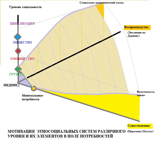 У отдельного взятого индивида может быть несколько метапотребностей, причем разного типа. С возрастом и опытом одна из них начинает доминировать, в то время как остальные играют подчиненную роль. Личные запросы индивида могут не совпадать с приоритетами образований более высокого порядка, составляющими социум: домохозяйство, община, производственныq коллектив, сословие, класс и т.д. Таким образом, структура социума является результатом конфликта сообществ с разными видами обмена продуком, одни из которых доминируют над другими. Но и конфликт, и доминирование возможны только при их интеграции на более низком уровне. В общем виде потребности и метапотребности принимают форму кувшина, изображённого на схеме 3б.