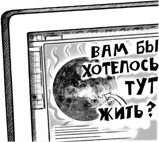 И всё же Венера – это совсем другой мир. На Венере очень плотная, ядовитая атмосфера, состоящая в основном из углекислого газа с облаками серной кислоты. Толстый слой этих облаков не пропускает тепло, поэтому Венера – самая горячая планета Солнечной системы: температура на её поверхности достигает 470 градусов по Цельсию – достаточно, чтобы расплавить свинец. Атмосферное давление на Венере в 90 раз выше земного. Это значит, что на поверхности Венеры человек испытывал бы такое же давление, как на дне земного океана.