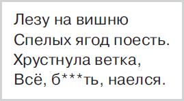 Первая строка «лезу на вишню» – типичный пример Present Continuous. Можно мысленно повторять ловкие движения автора. Кстати, при мыслях о каком-то действии в головном мозге активизируются те же зоны, что и при его выполнении.