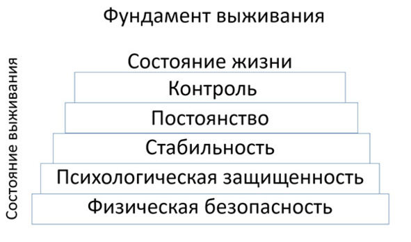 В психологии имеется понятие «фундамент выживания» (Рис 2). Только удовлетворив фундаментальные потребности, человек получает ресурс для творчества, хобби, для комфортной и приятной жизни.