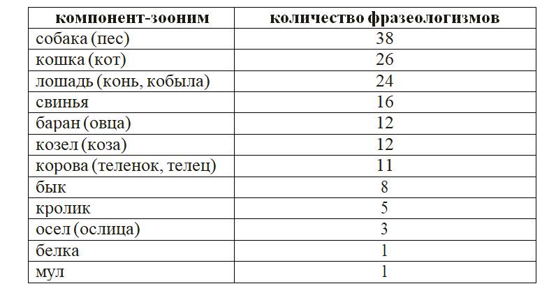 Таким образом, с точки зрения семантики среди фразеологических единиц с компонентом-зоонимом, называющим домашних животных, больше оборотов, описывающих действия и поведения людей. С точки зрения эквивалентности той или иной части речи самые большие группы составляют глагольные, адвербиальные и субстантивные фразеологические обороты. По структуре преобладают фразеологизмы, соответствующие сочетанию слов, среди которых самые большие группы составляют конструкции: имя прилагательное + имя существительное, глагол + имя существительное, конструкции с подчинительными союзами. С точки зрения экспрессивно-стилистических свойств разговорных фразеологизмов насчитывается больше всего.