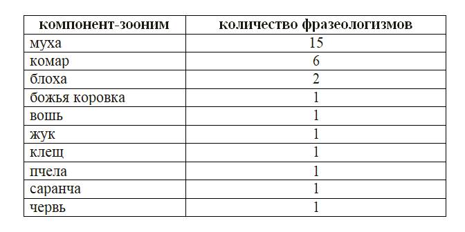 Точные данные по количеству выявленных фразеологизмов, в состав которых входит зооним, называющий насекомых и паукообразных, отражены в таблице №4.