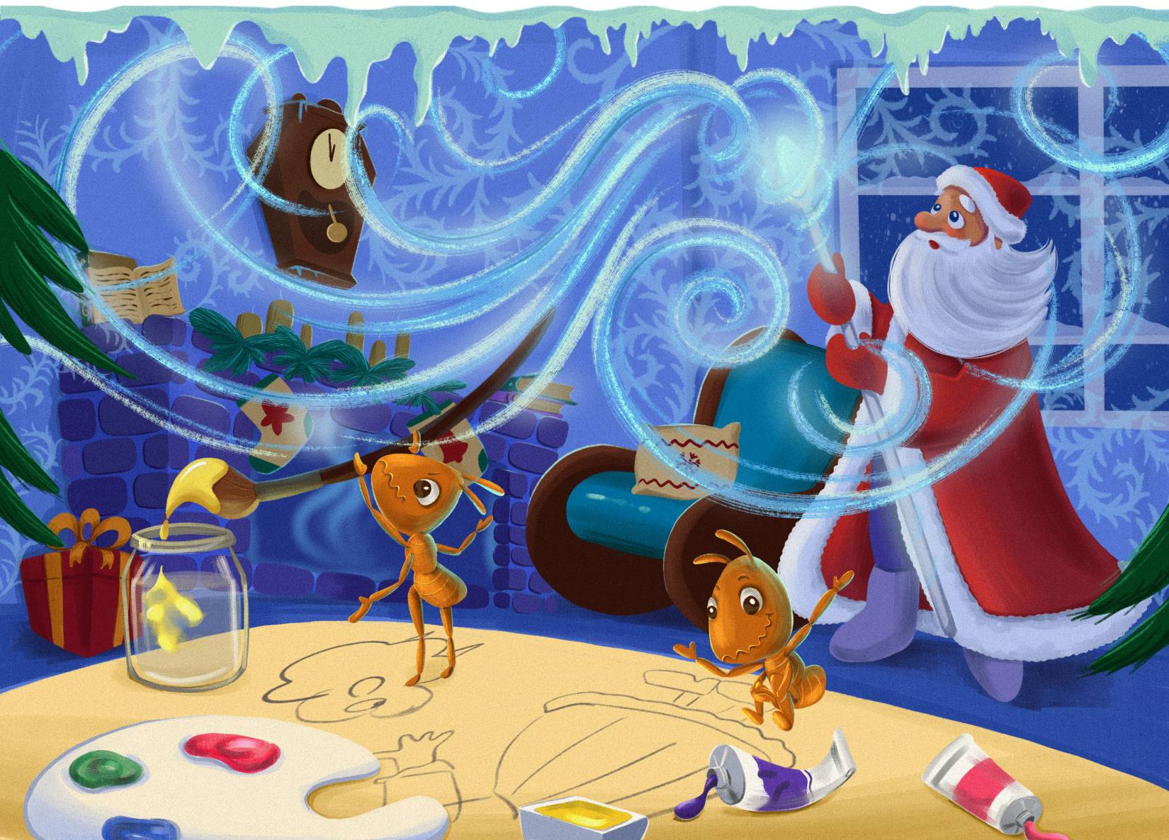 Из мешка вылетел вихрь снежинок. Они закружились в танце, выводя удивительные узоры. Завершив пируэт, композиция застыла на месте. Часы остановили стрелки на отметке 23:55. А перед термитами раскинулся холст, появились краски и кисти.